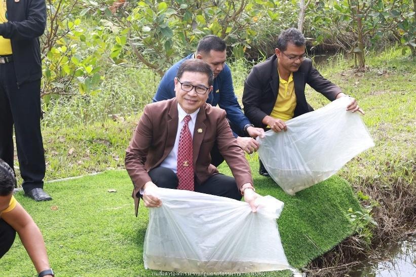 Nakhon Si Thammarat Rajabhat University (NSTRU) places great importance on water reuse to improve water efficiency and lessen the strain on natural water resources. The university has introduced a policy to treat and reuse water within the “Royal Project: One-Rai Rubber Forest” area, where treated water from the Sai Kai Canal is reused to irrigate vegetables and fruit trees. Aquatic animals are also released into the canal to help control algae growth and maintain ecological balance within the water system.