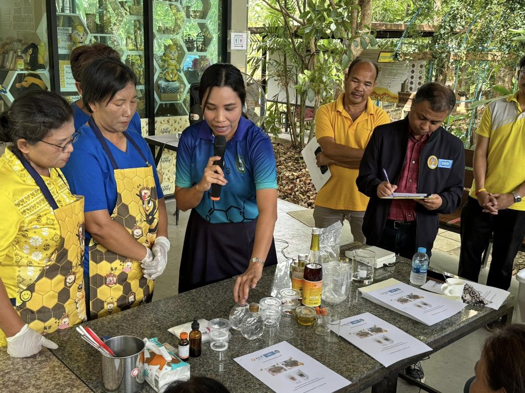 The activities took place between January and December 2024, covering several districts within Nakhon Si Thammarat province. On January 14, 2024, the university shared innovations for extracting and processing propolis obtained from stingless bees with the Ban Sai Hong natural Thai beekeeping community enterprise in Thung Song district, enhancing skills for adding value to agricultural products. A project on January 20, 2024, focused on upgrading the local food business “Phak Noh – Khanom Chin Mueang Khon” to generate economic value using local food culture. A field visit on March 25, 2024, to the Good Luck Sri community research center in Ban Khiri Wong involved transferring technology for using natural dyes in local products.